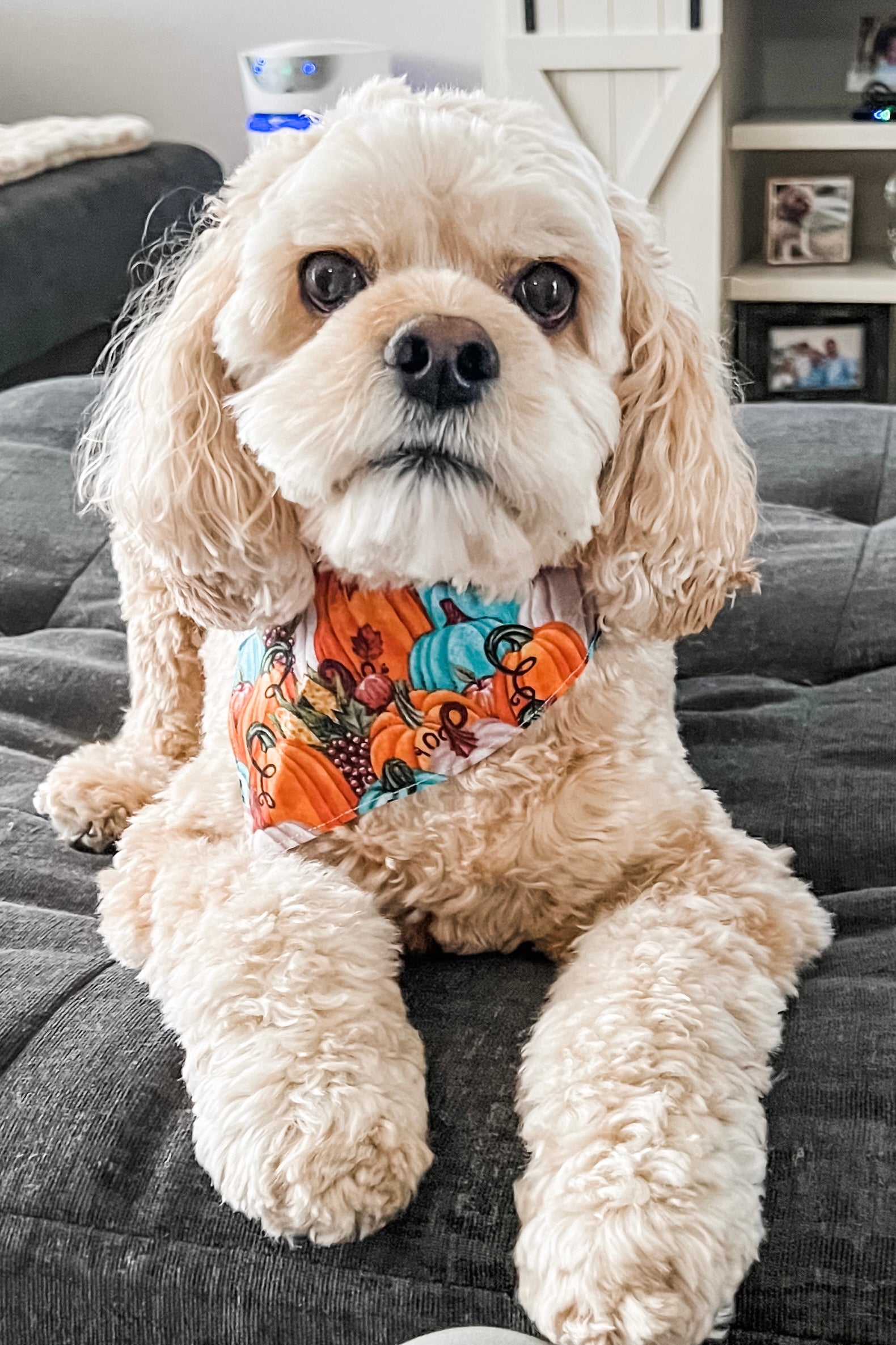 I purchased a very pretty bandanna with colorful pumpkins all over it for my Cockapoo. The communication and customer service with Calico Grove boutique was wonderful! And my dog looks so handsome in his new bandanna!